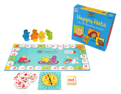 Contents include: game board, 44 hat tokens, 4 characters and stands, 40 word ending cards to create over 160 words, spinner, instructions with complete word list.